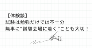 これらはどれも地味で当たり前ですが、試験会場に行くと、誰かしら受験票を忘れた人、時計を忘れた人、筆記用具を忘れた人はいます。実は私は「時計」は忘れたことがあります。あと試験中にトイレに行きたいと思った事とかあります。試験中にトイレに行かなくてもいいように対策することも大切です。