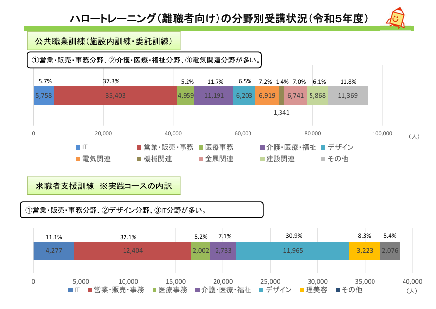 厚生労働省の「ハロートレーニング(離職者向け)」令和5年度データによると、受講分野には大きな偏りがある。