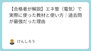 資格勉強方法 【合格者が解説】エネ管(電気)で実際に使った教材と使い方|過去問が最強だった理由 エネルギー管理士(電気)合格者が実際に使った教材と勉強法を解説。過去問集・模範解答集の違いやおすすめの使い方、独学での効率的な学習手順を紹介。 2025.10.06 資格勉強方法エネルギー管理士
